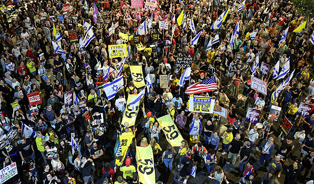 تظاهر الآلاف من الإسرائيليين مساء السبت في تل أبيب ومواقع وبلدات ومفارق رئيسية في البلاد، ضد حكومة نتنياهو وللمطالبة بوقف الحرب على غزة وإبرام صفقة تبادل أسرى من أجل استعادة الأسرى المحتجزين في القطاع.