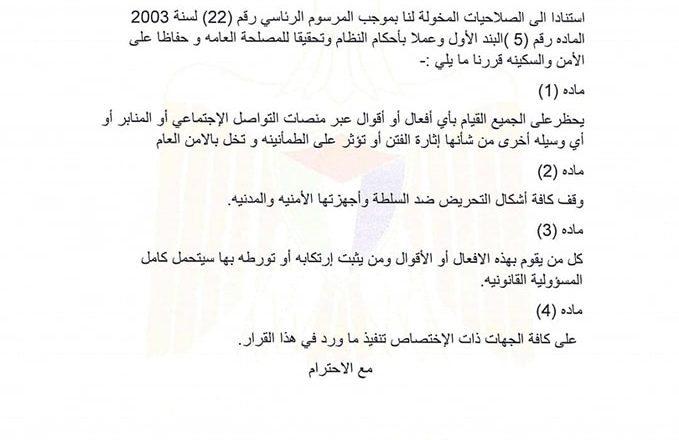 اصدر محافظ الخليل خالد دودين امرا يمنع بموجبه قول او كتابة اي مواد تحريضية على اجهزة الامن الفلسطينية ، وكل من يكتب يصبح تحت طائلة القانون .