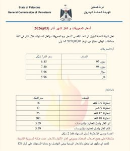 أعلنت الهيئة العامة للبترول، مساء اليوم السبت، أسعار المحروقات والغاز لشهر آذار (3/2026)، في محافظات الوطن كافة، على النحو التالي: