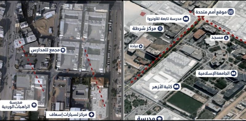 ومن بين المواقع التي ادعت إسرائيل، أن حركة حماس تستخدمها لعملها العسكري موقع لتصنيع الأسلحة بالقرب من مستشفى الشفاء، ومستودع أسلحة بالقرب من مسجد الشهيد في مخيم البريج، ومسار نفق في محيط مصنع بيبسي، بالاضافة الى مسارات لنفق بالقرب من مجمع مدارس يضم مدرسة راهبات الوردية ومدرسة الوحدة ومدرسة أم القرى الأساسية المشتركة، كما يكشف عن فتحة نفق بالقرب من الجامعة الاسلامية، حسب ما يدعي الأمن الإسرائيلي.