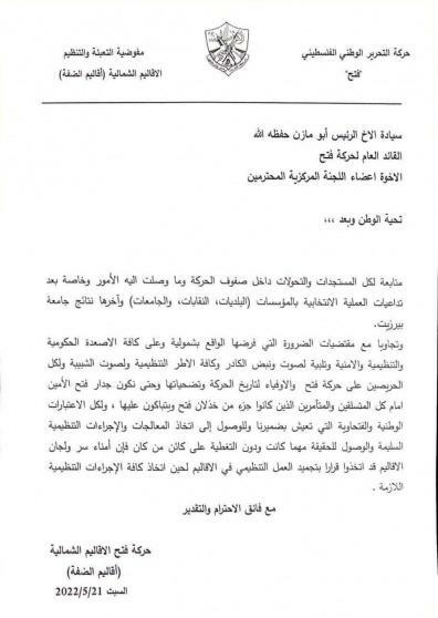 أعلنت الأقاليم الشمالية في حركة فتح مساء اليوم السبت، تجميد العمل التنظيمي في الأقاليم، وذلك عقب فوز الكتلة الإسلامية بانتخابات جامعة بيرزيت.