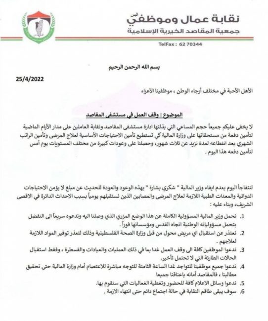 وفيما يلي نص البيان الذي أصدرته نقابة العاملين في المقاصد: