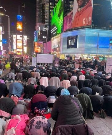 المشهد ليس من دولة عربية أو إسلامية حتى، إنّه في “تايمز سكوير” وهي نبض مدينة نيويورك الأميركية.
