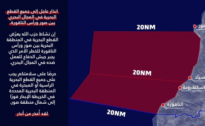 واضاف “حرصًا على سلامتكم يجب على جميع القطع البحرية الراسية أو المبحرة في المنطقة البحرية المحددة في الخريطة الإبحار فورًا إلى شمال منطقة صور”.
