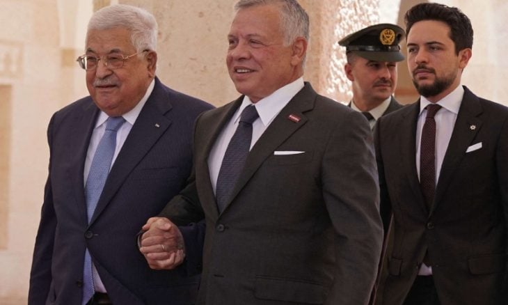 الوفد الفلسطيني المرافق لسيادته: أمين سر اللجنة التنفيذية لمنظمة التحرير حسين الشيخ، ورئيس جهاز المخابرات العامة اللواء ماجد فرج، ومستشار الرئيس للشؤون الدبلوماسية مجدي الخالدي، وسفير فلسطين لدى الأردن عطا الله خيري.