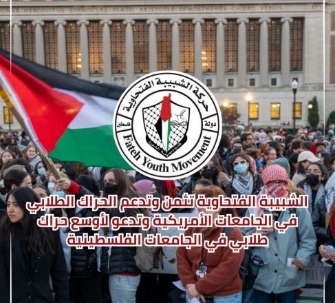 وتابعت، “أمام عظمة هذا الحراك تثمن حركة الشبيبة الفتحاوية الدعوات الواضحة والصريحة الموجهة من الطلبة والأكاديميين المعتصمين لإدارات الجامعات في الولايات المتحدة الأمريكية بوقف الاستثمارات في الشركات الداعمة لجيش الاحتلال الإسرائيلي والتي توفر له الإمكانيات الاقتصادية والعسكرية والقدرات المختلفة لاستمراره في احتلال الأراضي الفلسطينية وحرب الإبادة والمجازر ضد المدنيين والأطفال والنساء في قطاع غزة، بما يحول دون إحقاق الحق الفلسطيني”.