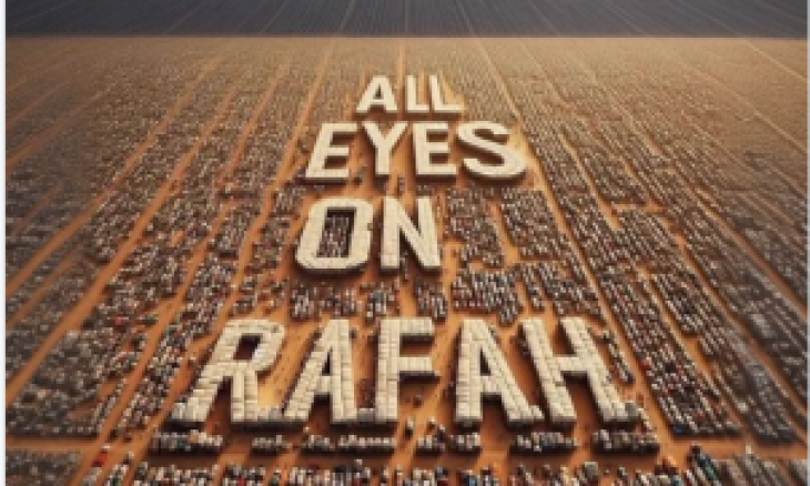الحملة بدأت بصورة تبرز مشهدا من الأعلى لاكتظاظ المدينة بمخيمات النازحين العزّل في بقعة جغرافية محدودة، وكتب عبارة “ALL EYES ON RAFAH/ كل العيون على رفح” باستخدام خيم بيضاء وسط المشهد.