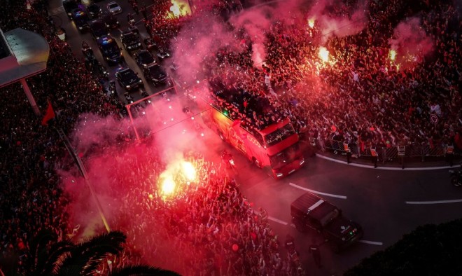 وحمل اللاعبون العلم المغربي، وهم يهتفون لوطنهم، وحيّوا المواطنين على جنبات الشوارع.