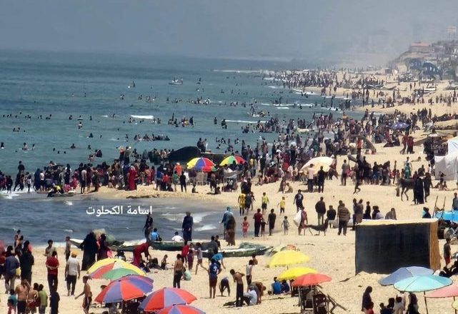 عدسة الصحفي أسامة الكحلوت رصدت جموع المواطنين والنازحين في دير البلح جنوب قطاع غزة وهم على شاطئ البحر الأبيض المتوسط الذي لا طالما كان الغزيون محسودين على ” نعمة” البحر.