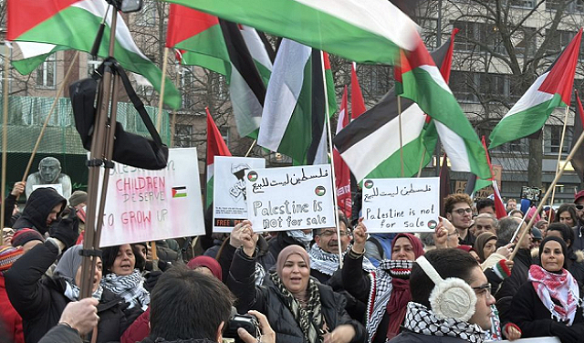 وحمل المتظاهرون أعلام فلسطين ولافتات كتب عليها “ارفعوا أيديكم عن الضفة الغربية”، و”توقفوا عن تسليح إسرائيل”، و”غزة ليست للبيع”، و”الحرية لفلسطين”، و”أطفال فلسطين يستحقون أن يكبروا”.