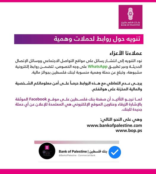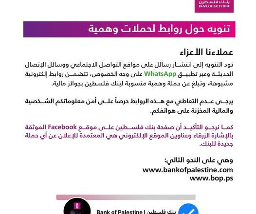 أصدر بنك فلسطين تنويها هاما حول روابط لحملات وهمية عبر مواقع التواصل الاجتماعي وخاصة تطبيق “واتس أب” تبلغ عن جوائز مالية.