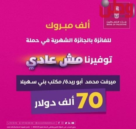 أعلن بنك فلسطين فوز السيدة ميرفت محمد رمضان أبو ريدة من مكتب بنك فلسطين في بني سهيلا بمدينة غزة بالجائزة الشهرية لحسابات التوفير والبالغ قيمتها 70 ألف دولار، ضمن الحملة التي أطلقها البنك على برنامج حسابات التوفير في كافة فروعه المنتشرة بمختلف محافظات الوطن تحت شعار “توفيرنا مش عادي”.