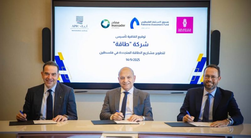 وقّعت كل من شركة مصادر، الذراع الاستثمارية لصندوق الاستثمار الفلسطيني في قطاع الطاقة، والشركة العربية الفلسطينية للاستثمار (أيبك)، ومجموعة بنك فلسطين، اتفاقية شراكة استراتيجية لتأسيس شركة “طاقة”، التي ستُشكّل كياناً اقتصادياً واستثمارياً وتطويرياً رائداً لتعزيز قطاع الطاقة المتجددة في فلسطين.