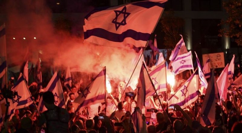 رفع المحتجون الأعلام الإسرائيلية ورددوا شعار “الديموقراطية” قبل حفل لمغنين شعبيين على غرار ما تشهده مدن أخرى في البلد حيث أقيمت منصات وحفلات موسيقية مفتوحة في الشوارع.