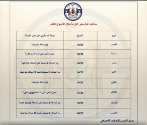 أعلنت الإدارة العامة للمعابر والحدود، يوم الأربعاء، عن تعديل ساعات عمل معبر الكرامة الأسبوع المقبل، بدءا من يوم الخميس وحتى الخميس المقبل.