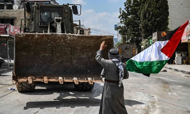 من بين مظاهر التدمير في جنين، إثر العملية الإسرائيلية الوحشية الأخيرة، يظهر رجل فلسطيني مسنّ يرفع العلم الفلسطيني واقفاً أمام المركبات والجرافات العسكرية الإسرائيلية.