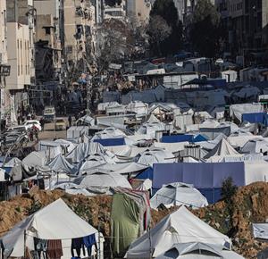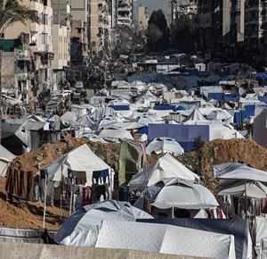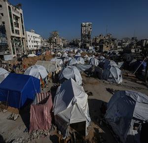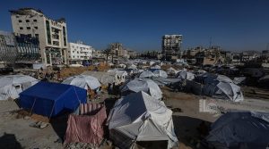 غزة \ مدار نيوز \ مواطنون ينصبون خياما على أنقاض المنازل المدمرة في مدينة غزة بعد نزوحهم قسرا من شمال القطاع