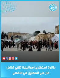 طائرة إسرائيلية تلقي القنابل الغازية بإتجاه المصلين في الأقصى
