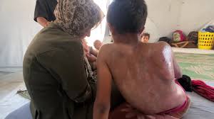 الطفل جمال عبد ربه (12 عامًا) يتلقى الرعاية من والدته في مخيم لإيواء النازحين الفلسطينيين غرب مدينة غزة، بعد إصابته بحروق جراء سكب طعام ساخن على جسده خلال تدافع للحصول على القليل من الطعام من مطبخ خيري.