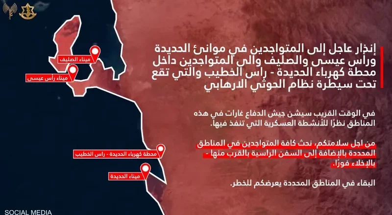 وأضاف أدرعي في بيان “إنذار عاجل إلى المتواجدين في موانئ الحديدة ورأس عيسى والصليف وإلى المتواجدين داخل محطة كهرباء الحديدة، سيشن جيش الدفاع في الوقت القريب غارات في هذه المناطق نظرا للأنشطة العسكرية التي تنفذ فيها”.