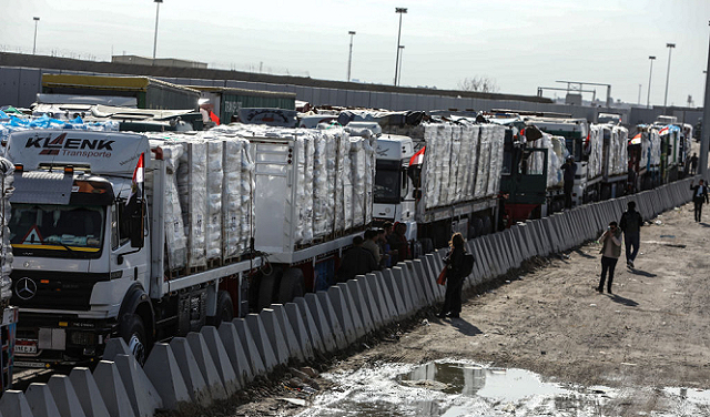 ورصد صحافيون متواجدون في الجانب المصري من الحدود مع غزة، مئات الشاحنات المحمّلة مساعدات إنسانية عند معبر رفح الحدودي وحول العريش، على بعد 50 كيلومترا إلى الغرب.