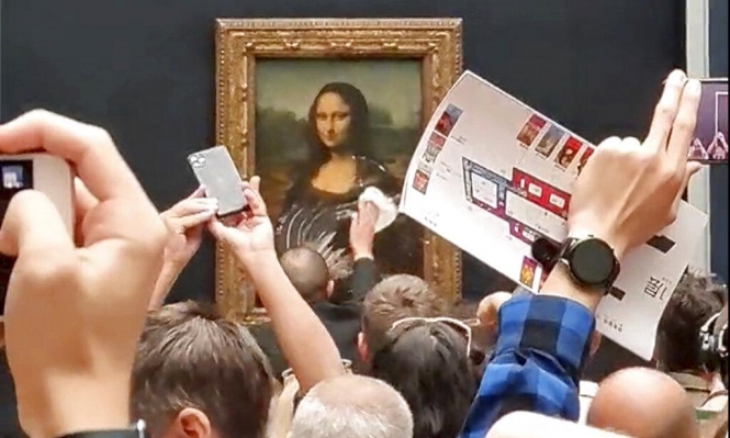 ألقى رجل تنكر كامرأة عجوز على مقعد متحرك بقطعة كعك على زجاج يحمي لوحة الموناليزا، الأحد، في متحف اللوفر وصرخ في الناس ليفكروا في كوكب الأرض.