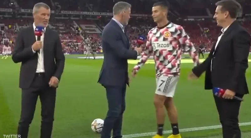 وخلال وقوف كاراغر مع نجوم الدوري السابقين، غاري نيفل وروي كين، داخل استاد أولد ترافورد، لتحليل اللقاء مع محطة “سكاي سبورتس”، توجه رونالدو لفريق القناة خلال الإحماء.