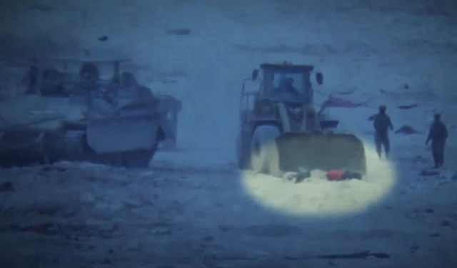 بعد ذلك تظهر في المكان جرافة للجيش الإسرائيلي، وهي تدفع جثتي الشابين، باتجاه حفرة وتدفنهما بالرمال والقمامة المنتشرة في المكان.