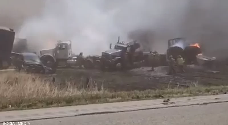 ونقلت شبكة “سكاي نيوز” البريطانية عن ضابط شرطة قوله، إن الحادث نجم عن تصادم ما بين 40- 60 سيارة شاحنة.