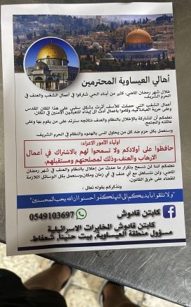 وجاء في المنشورات أن أهالي العيسوية “شاركوا في رمضان الماضي بأعمال شغب في الحرم الشريف، ونعلمكم بأننا لن نسمح بتكرار ما حدث من إخلال بالنظام ولن نتساهل، وسنعمل بكل الوسائل اللازمة للقضاء على خرق القانون”.