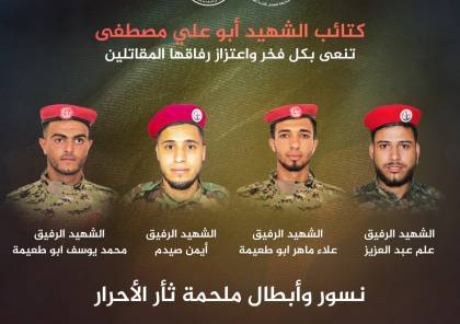 وقالت الكتائب في بيانٍ صدر عنها اليوم الأربعاء، إنّ مقاتليها الأبطال هم من وحدتي الصاروخية والمدفعية، وقد ارتقوا خلال تأديتهم لواجبهم الوطني خلال عملية “ثأر الأحرار” لدماء الشهداء و رداً على جرائم الاحتلال بعد استهداف صهيوني جبان وهم : – الشهيد البطل / محمد يوسف أبو طعيمة ” خانيونس ” – الشهيد البطل / علاء ماهر أبو طعيمة ” خانيونس ” – الشهيد البطل / أيمن كرم صيدم ” رفح ” – الشهيد البطل / علم سمير عبد العزيز ” رفح.