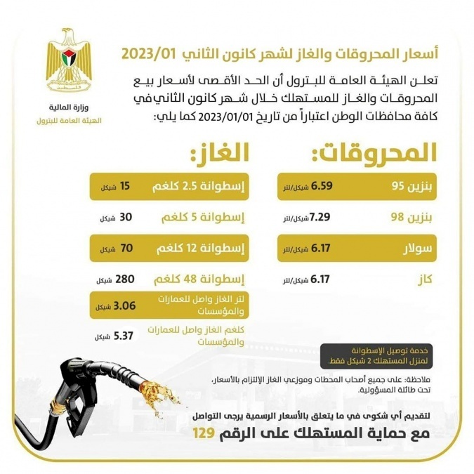 أعلنت وزارة المالية مساء اليوم السبت، أسعار المحروقات والغاز لشهر كانون ثاني/ يناير 2023.