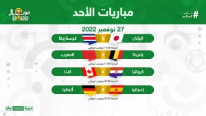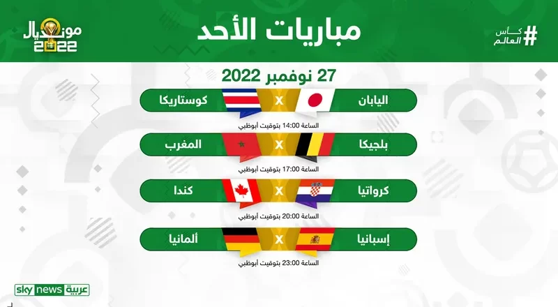 ففي الساعة الثانية ظهرا بتوقيت أبوظبي، يلتقي منتخبا اليابان وكوستاريكا على ملعب أحمد بن علي.