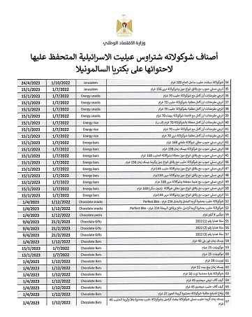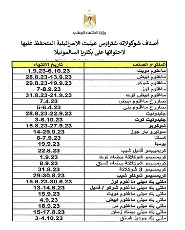 حذرت وزارة الاقتصاد الوطني، اليوم الثلاثاء، جمهور المستهلكين من شراء أصناف من منتجات شركة “شتراوس” الإسرائيلية، المدرجة في القوائم المرفقة، بعد إثبات الفحوصات وجود بكتيريا السالمونيلا في خطوط الإنتاج في الشركة المصنعة.