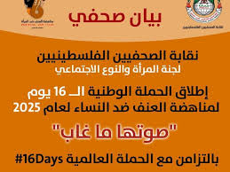 أعلنت نقابة الصحفيين الفلسطينيين، عن إطلاقها الحملة الوطنية لـ16 يوما لمناهضة العنف ضد النساء لعام 2025 تحت شعار “صوتها ما غاب”.